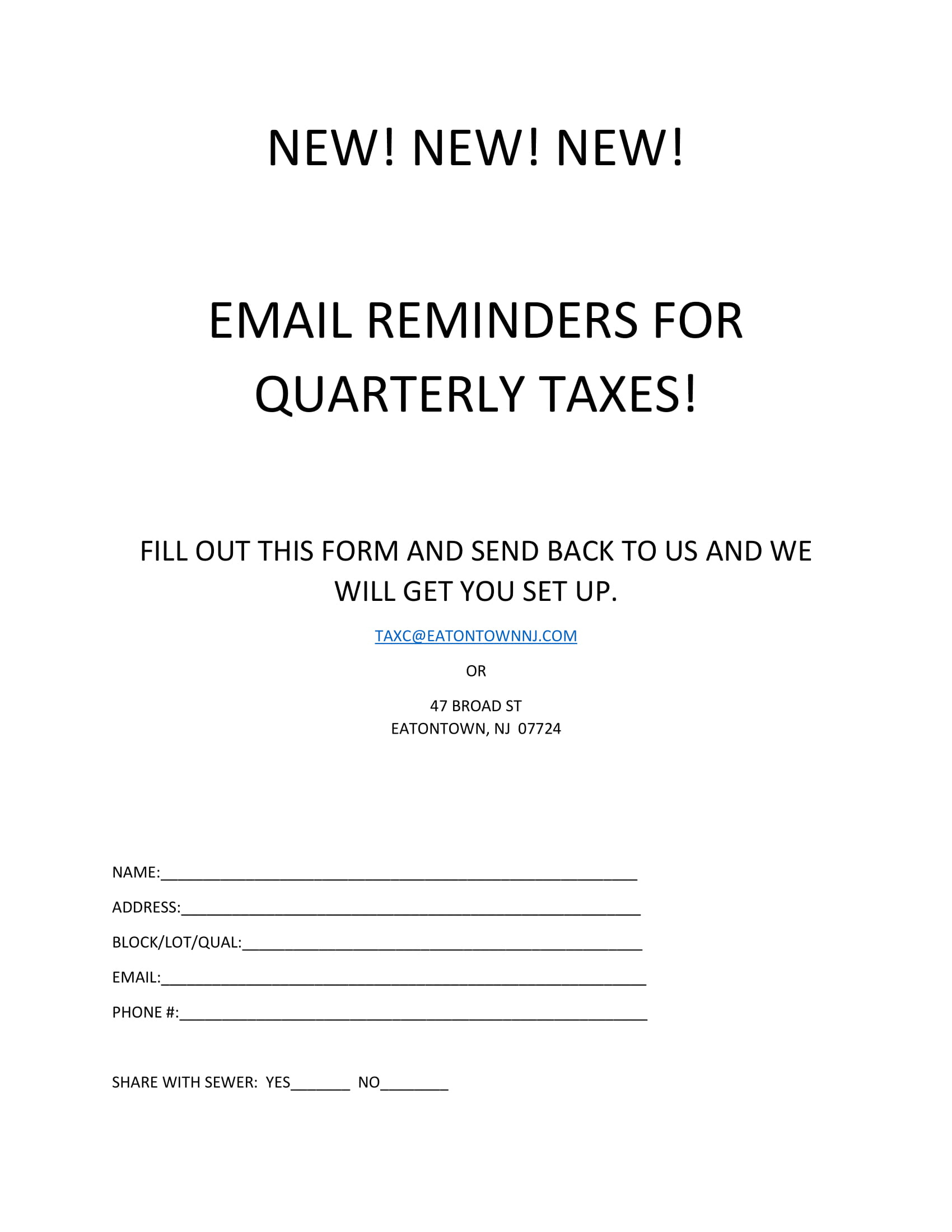 The Tax Collector is responsible for billing and collection of tax payments, advising property owners of NJ Tax Relief Programs, and assisting residents with problems relating to their mortgage escrow accounts.